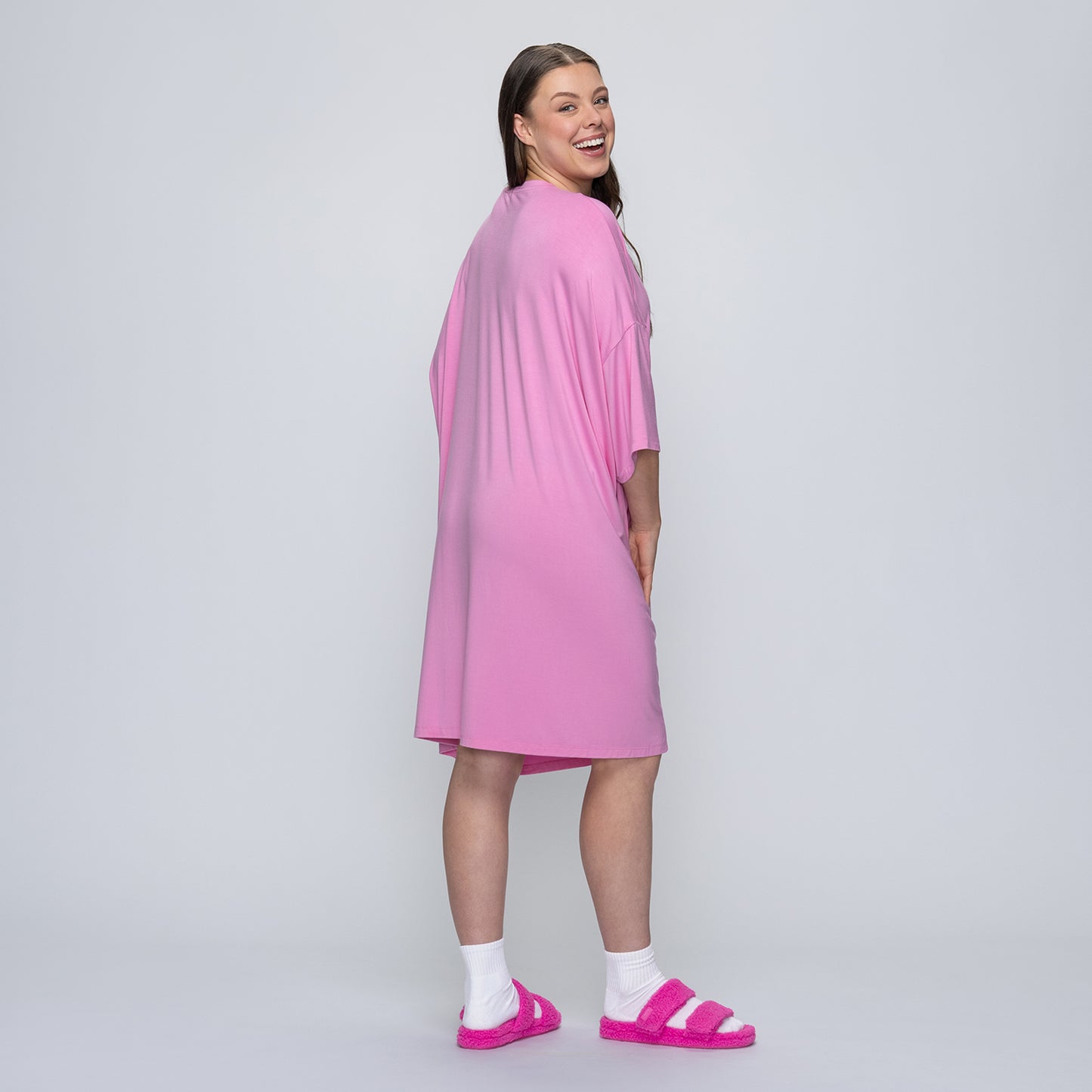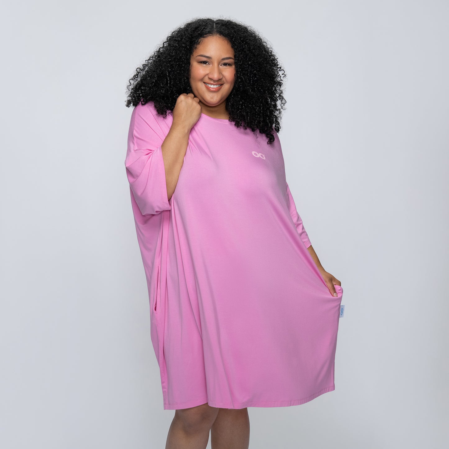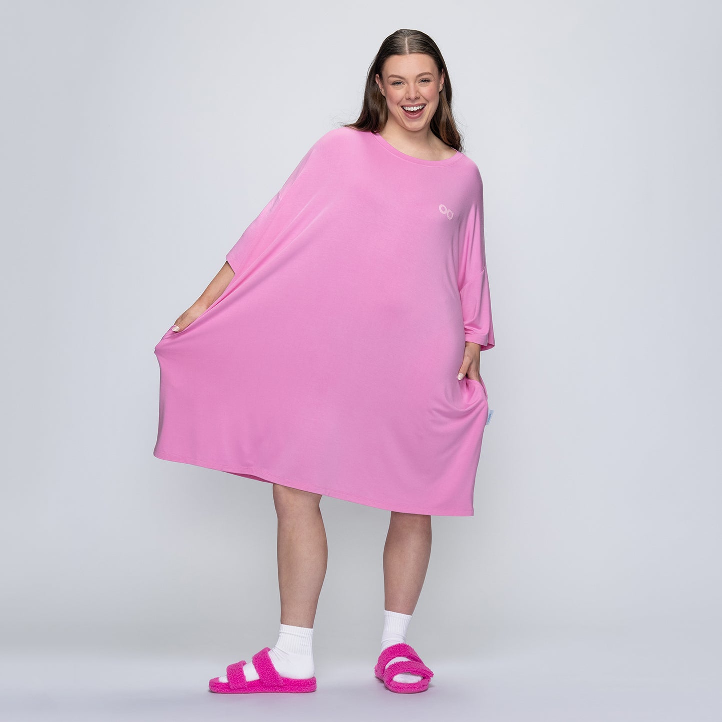 Both styles share the same oversized fit and features (like side pockets), but the fabric is where they differ. Our classic Sleep Tees are made from a lightweight bamboo blend – perfect for hot sleepers, warm climates, or summer nights.