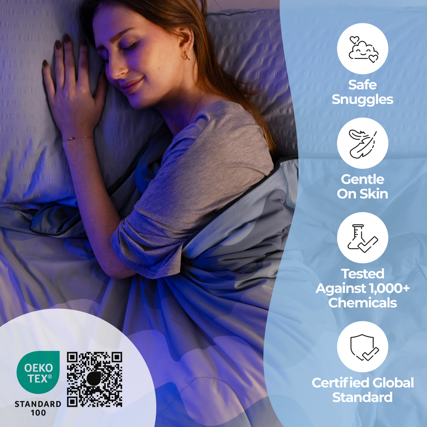 Our Cooling Blanket is made from breathable, moisture-wicking fibers that help release heat and keep you cool. With a Qmax score of 0.32, the fabric feels 2–5°C cooler than your skin, giving you a comfortable night’s rest.