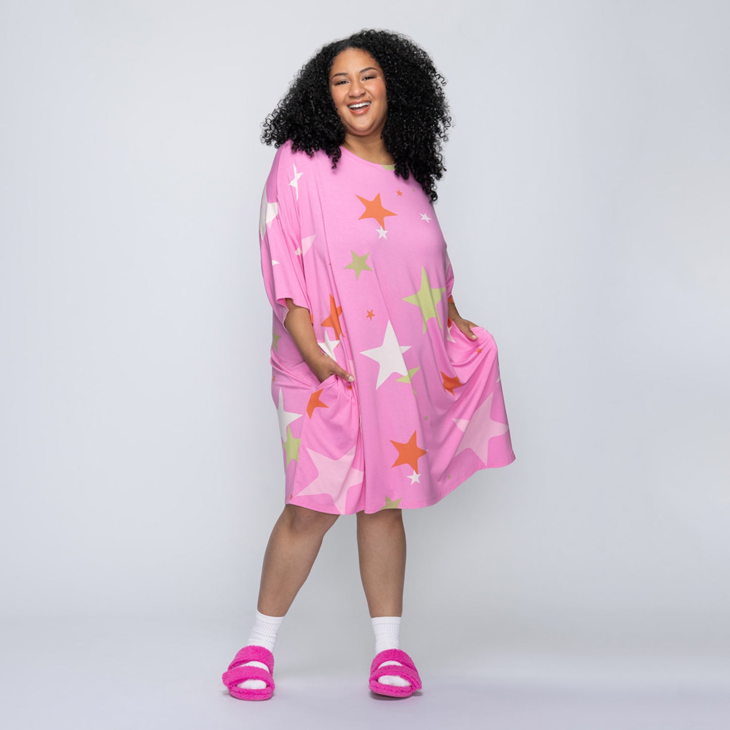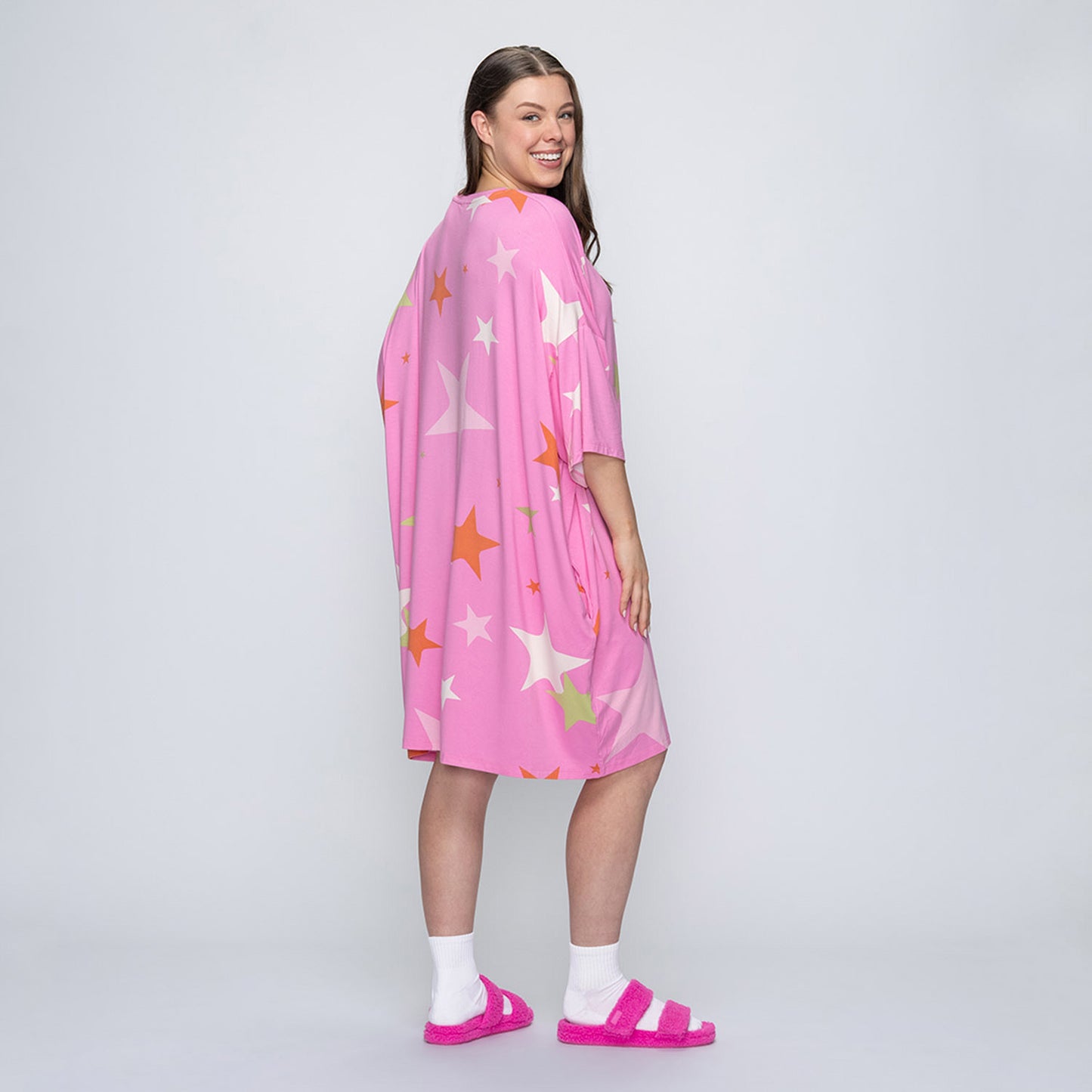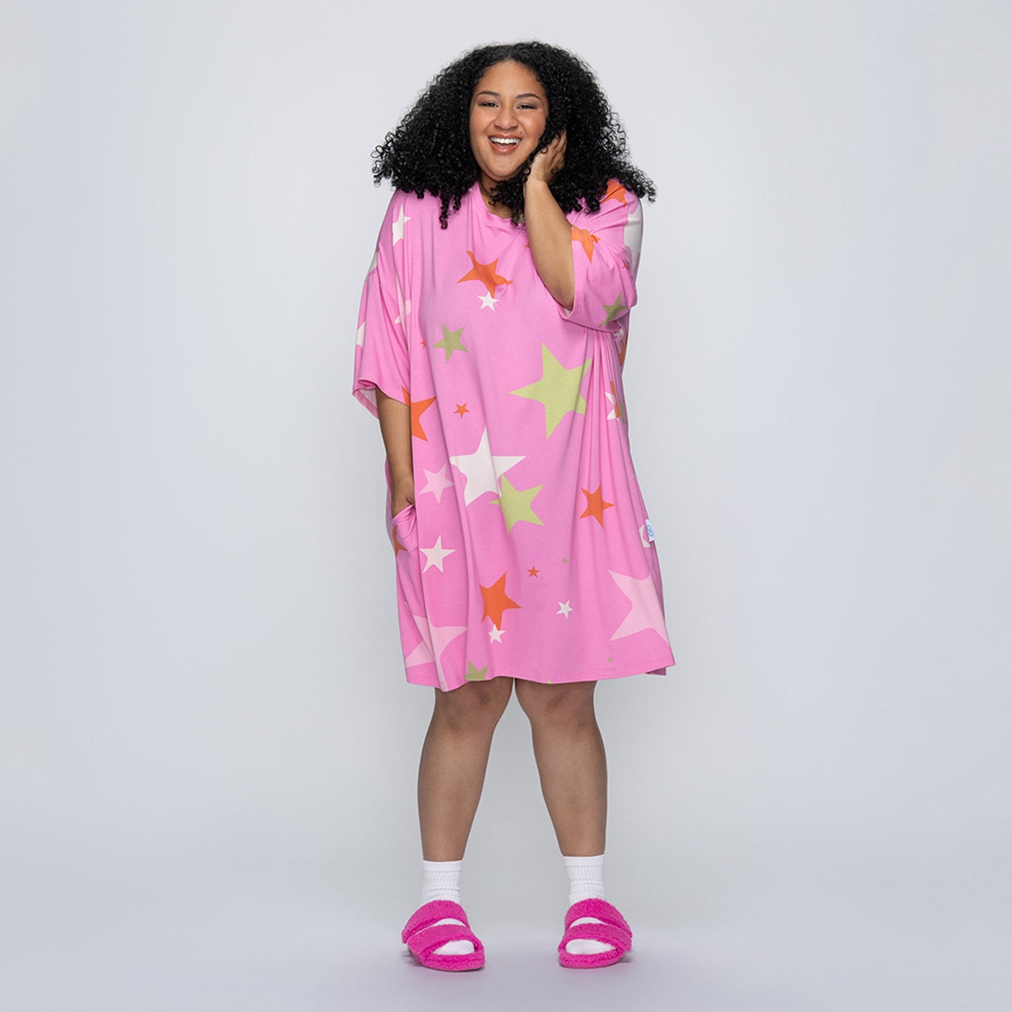 Both styles share the same oversized fit and features (like side pockets), but the fabric is where they differ. Our classic Sleep Tees are made from a lightweight bamboo blend – perfect for hot sleepers, warm climates, or summer nights.