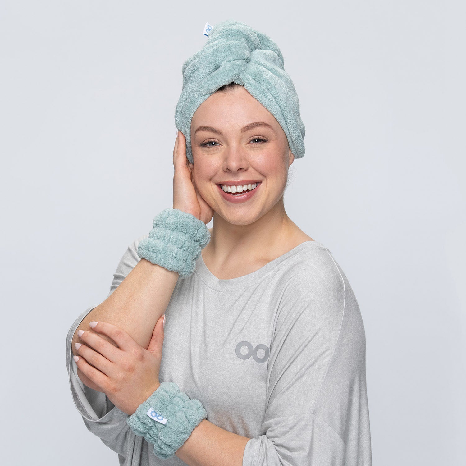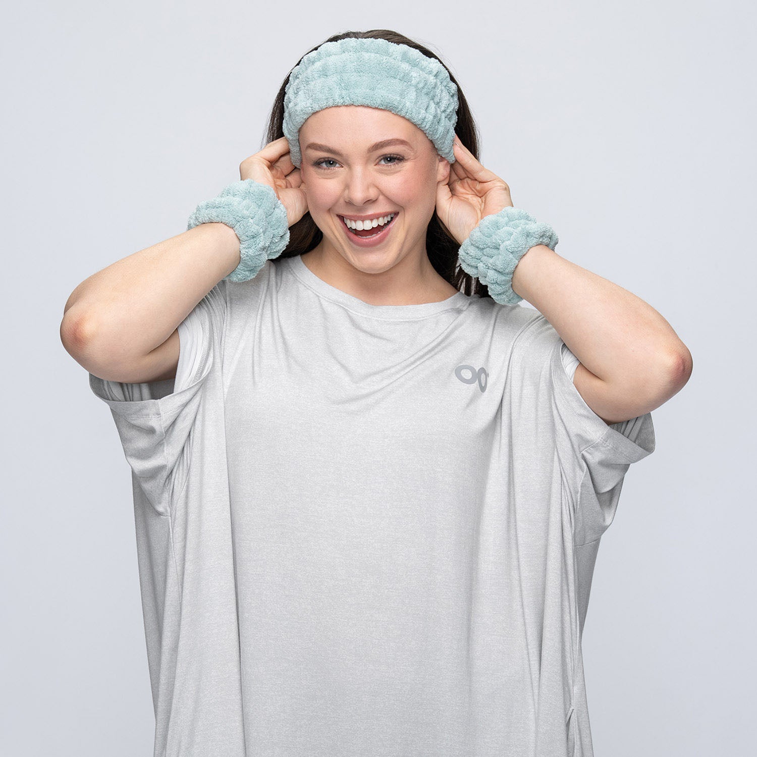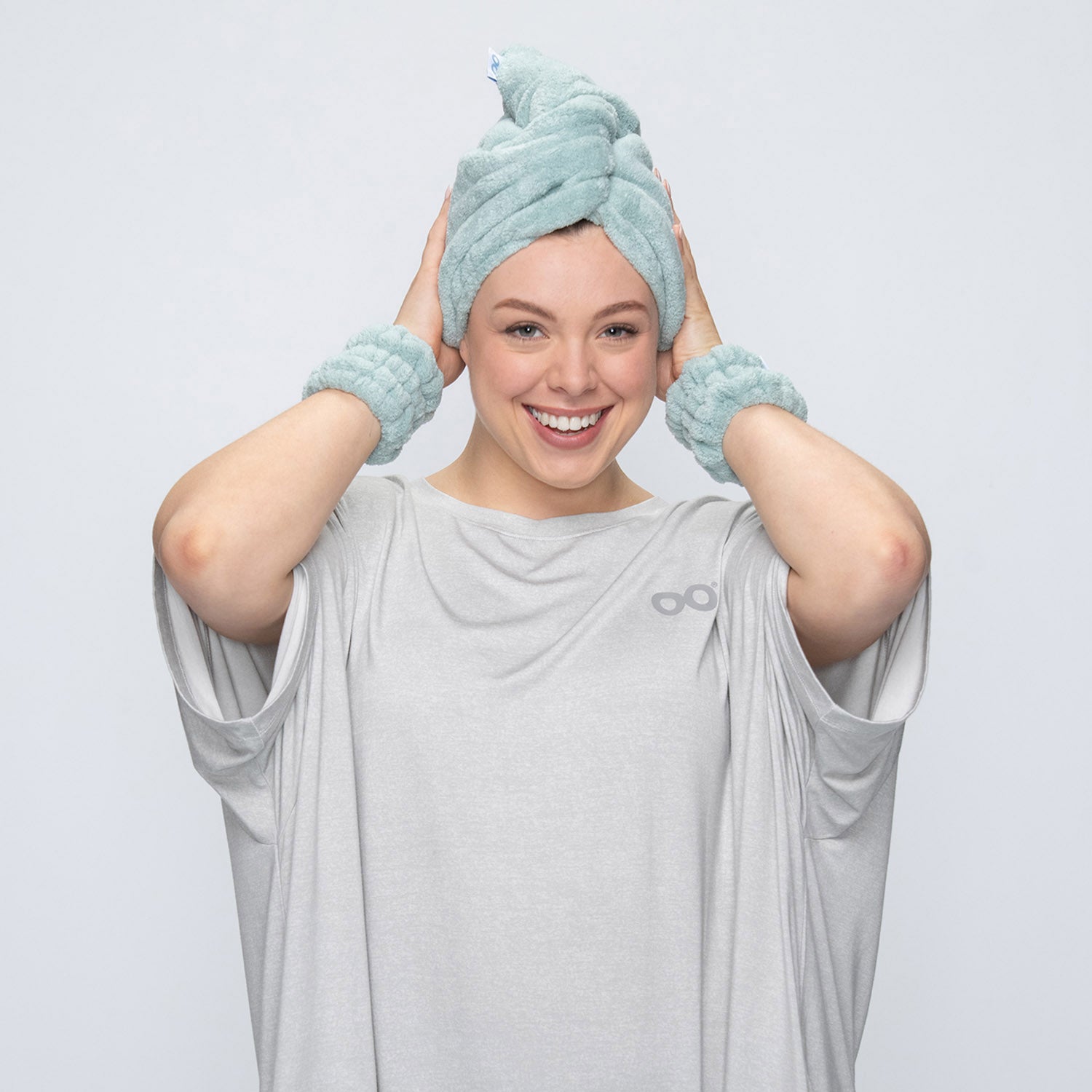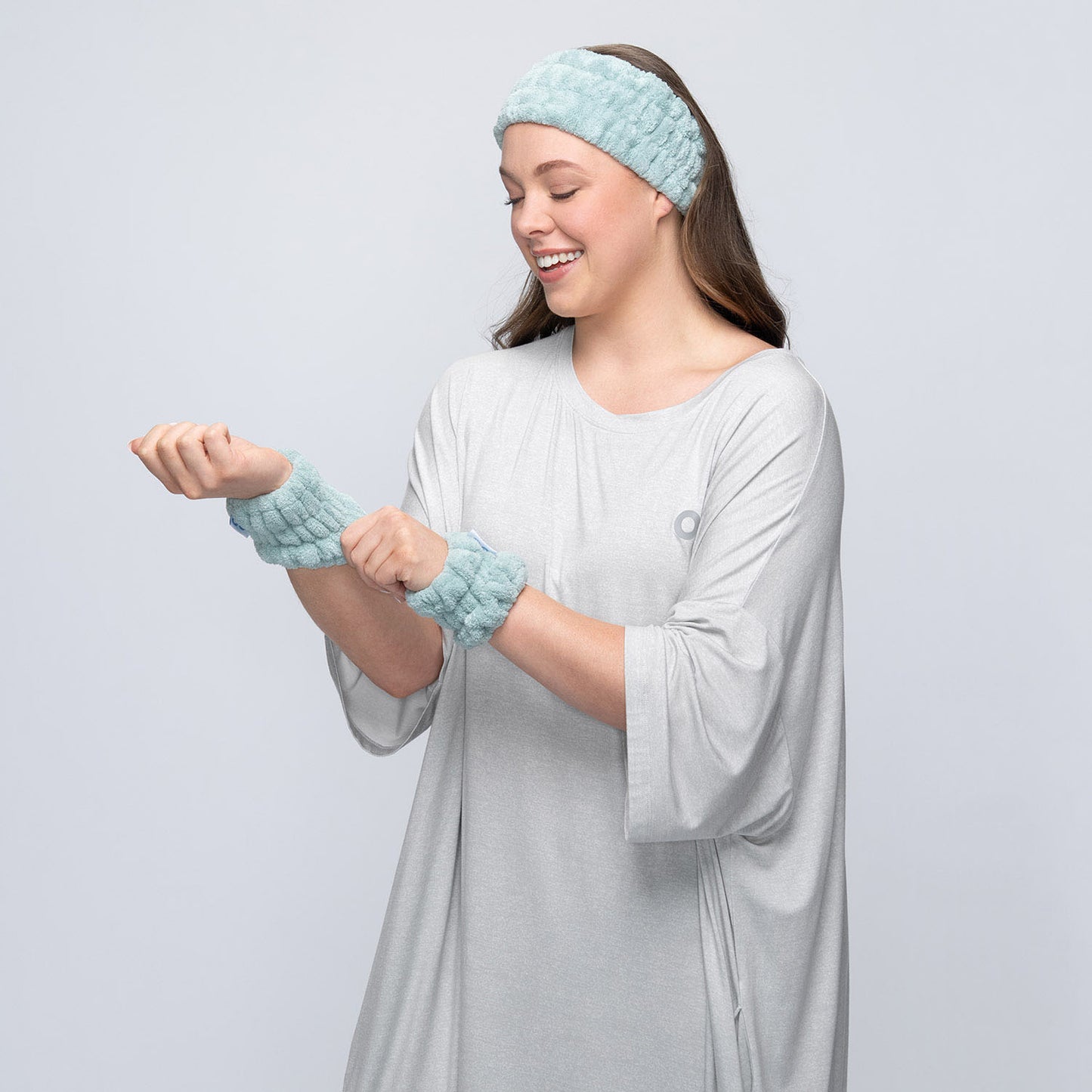 Use our Pamper Pack for your daily routine – from removing makeup to getting ready for the day. Slip on the wash cuffs to prevent liquid spills and keep sleeves dry, pop on the headband to tuck away flyaways, and twist up your hair in the turban for quick, cosy drying. No heavy towels, no fuss.