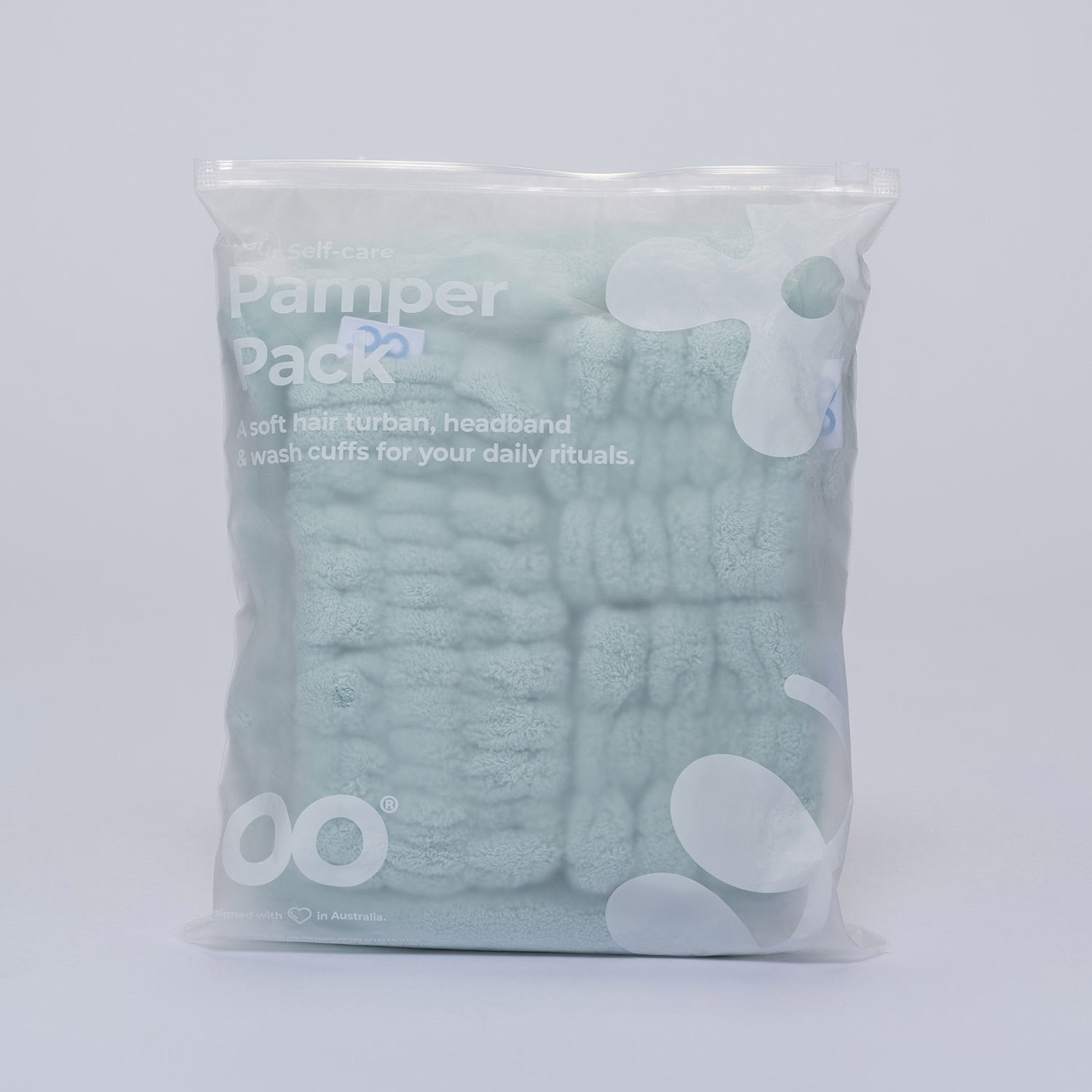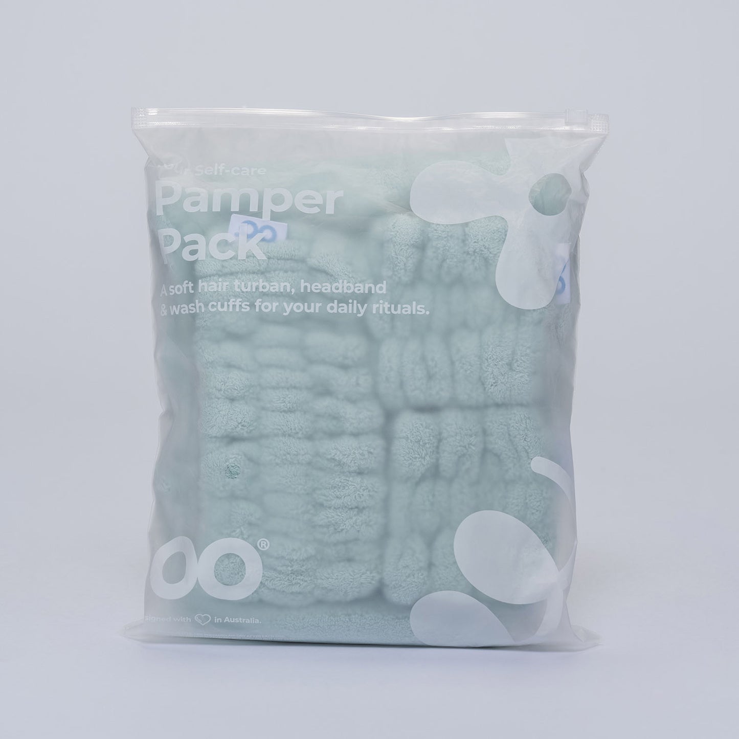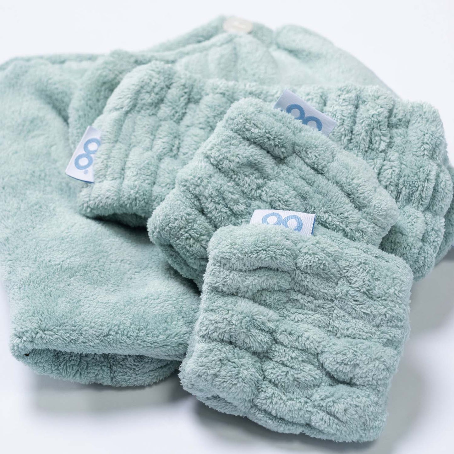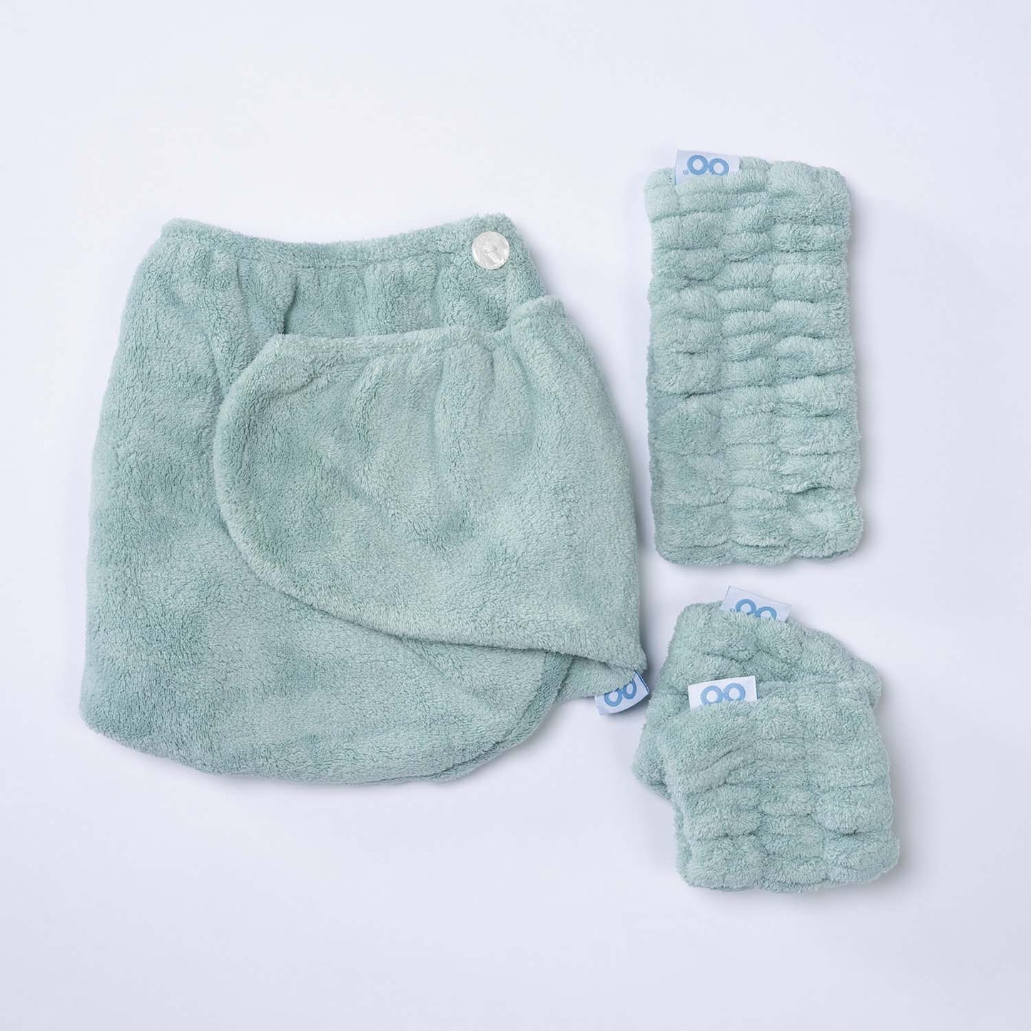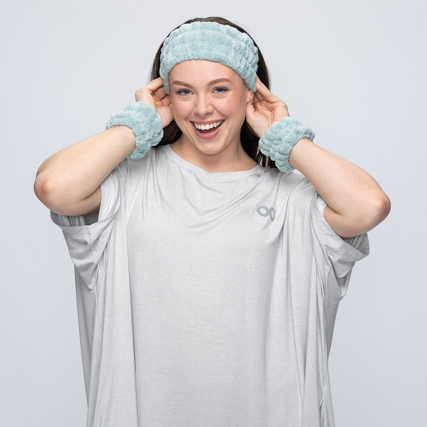 Use our Pamper Pack for your daily routine – from removing makeup to getting ready for the day. Slip on the wash cuffs to prevent liquid spills and keep sleeves dry, pop on the headband to tuck away flyaways, and twist up your hair in the turban for quick, cosy drying. No heavy towels, no fuss.